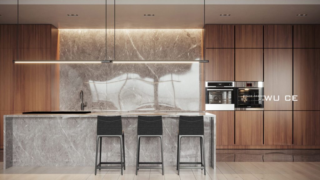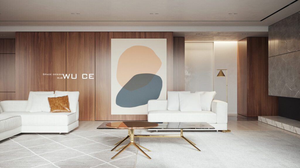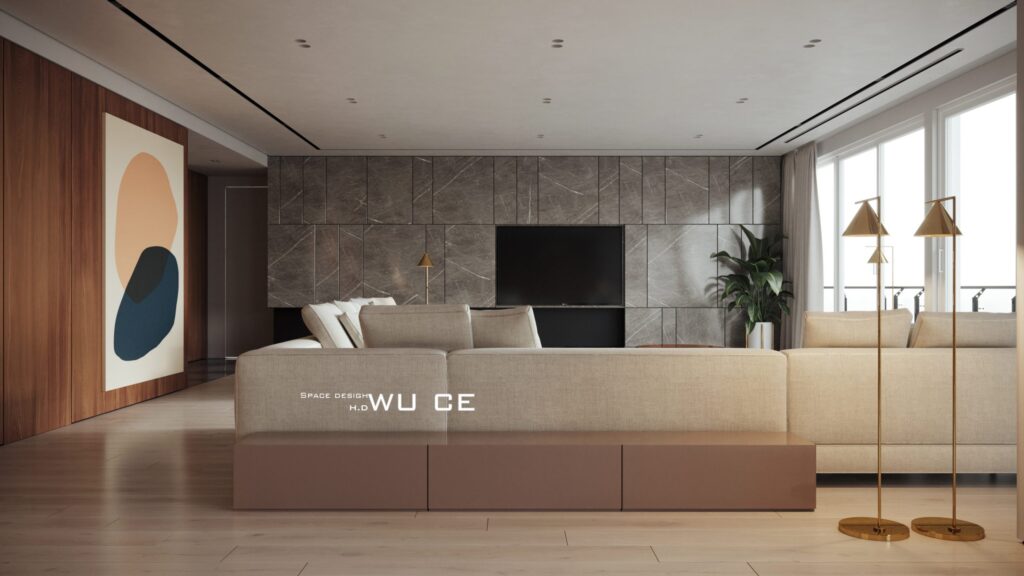 木色墻板與亞黑極窄金屬線條的碰撞,豐富了墻面層次。