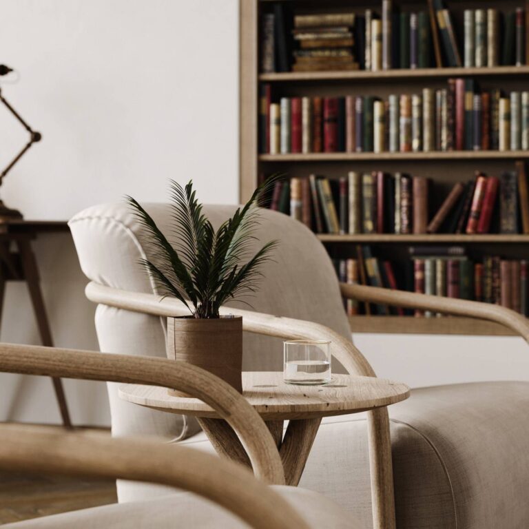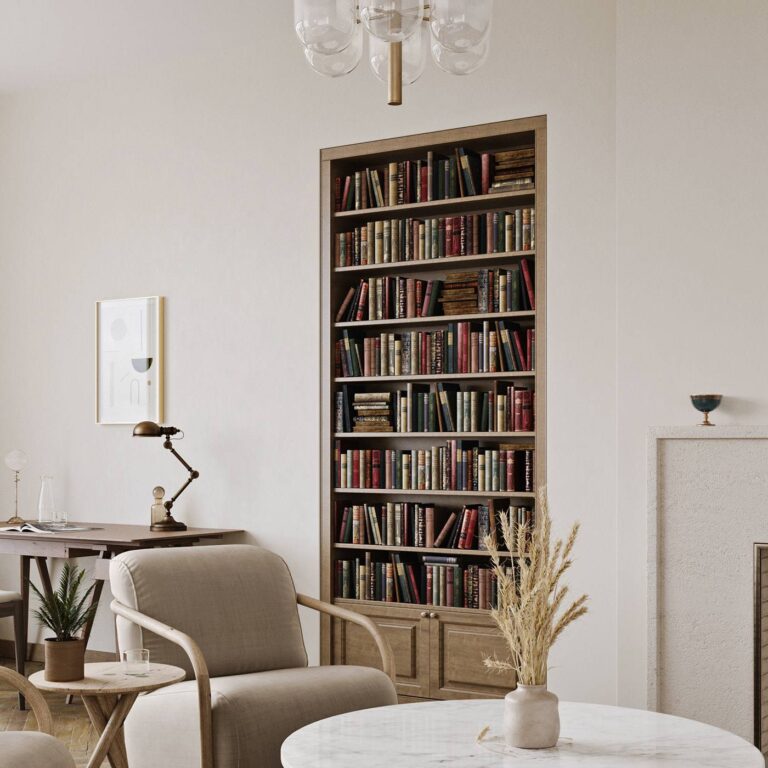 主要的目標是保持色調的中性,棕色是主要的對比,黑暗的書柜和它的道具。