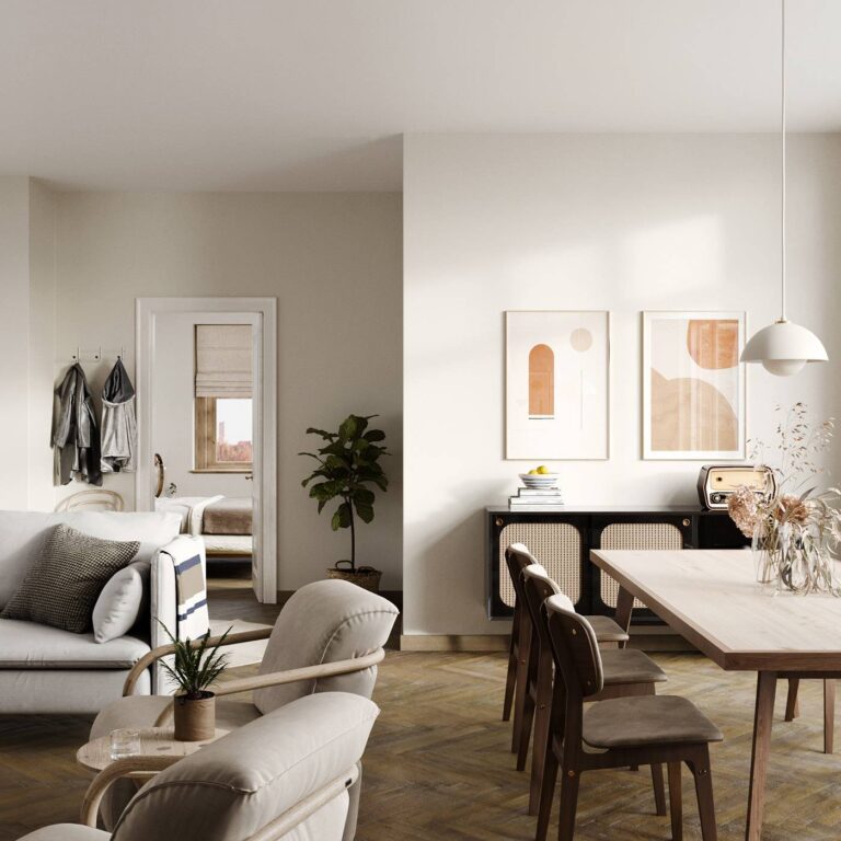 本案是一套簡約北歐設計,純色墻面點綴精致復古配飾,中性色調的木質家具,烘托了安靜自然的空間氛圍。