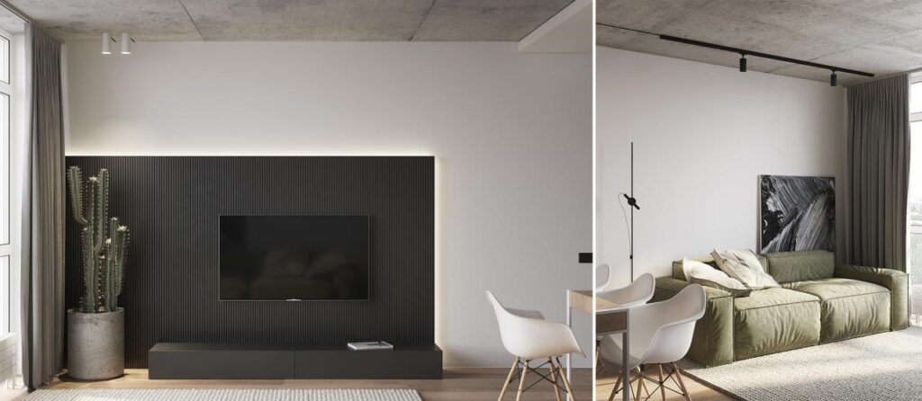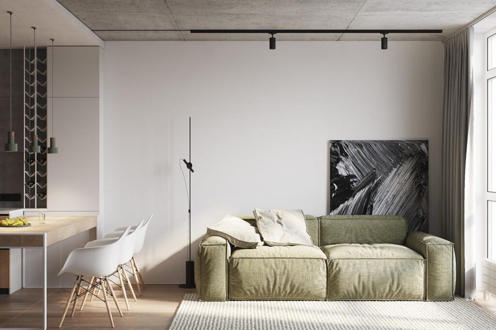 客廳線條硬朗,白色墻面與黑色格柵的強烈碰撞,簡單干凈又賦有沖擊力,橄欖綠的沙發(fā)柔和飽滿,柔軟的曲線與硬朗的空間相輔相成。
