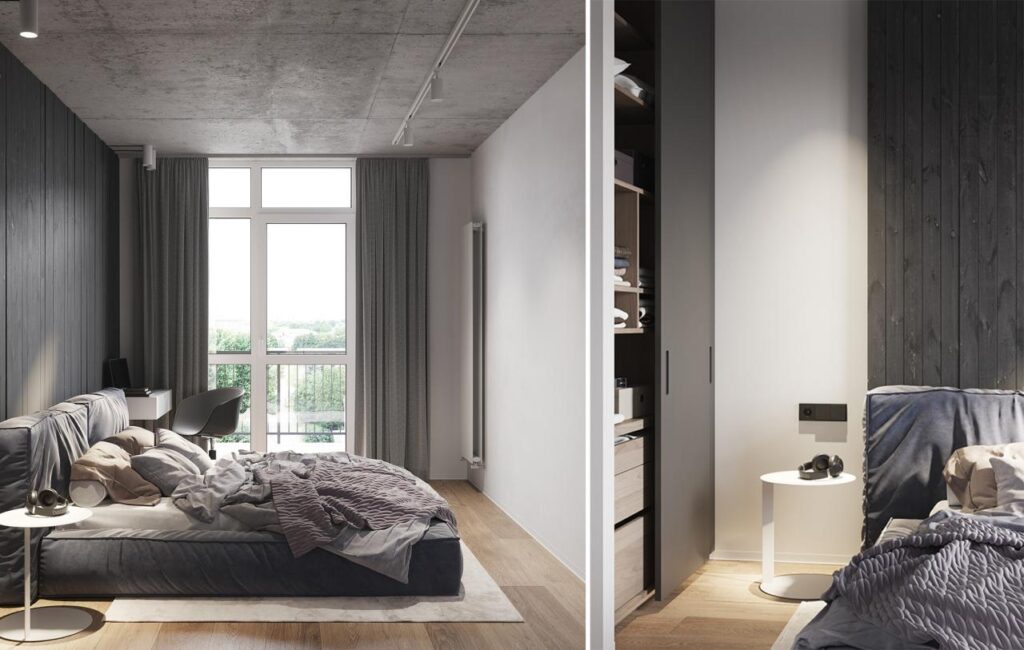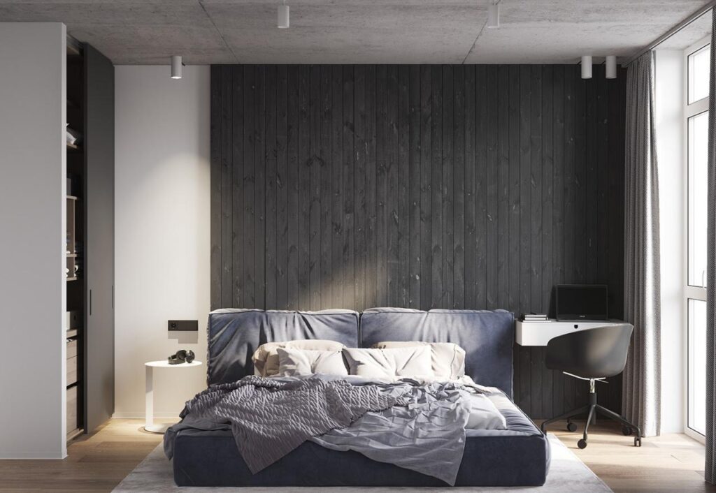 臥室以灰白為主調(diào),深灰的木飾面做背景,面積大卻不壓抑,表面的木質(zhì)肌理紋路豐富了背景層次,原木色系地板調(diào)節(jié)了整體的氛圍,低調(diào)輕奢中又不失溫暖。