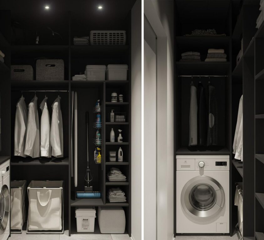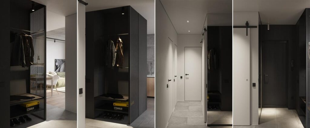 衣帽間簡潔大氣,深色的定制柜配部分玻璃門,質(zhì)感高級,套裝門極簡輕奢,二者黑白鮮明,對比強烈,讓人一眼難忘。