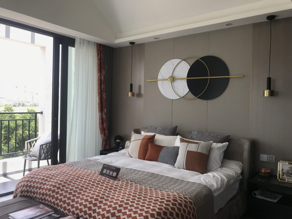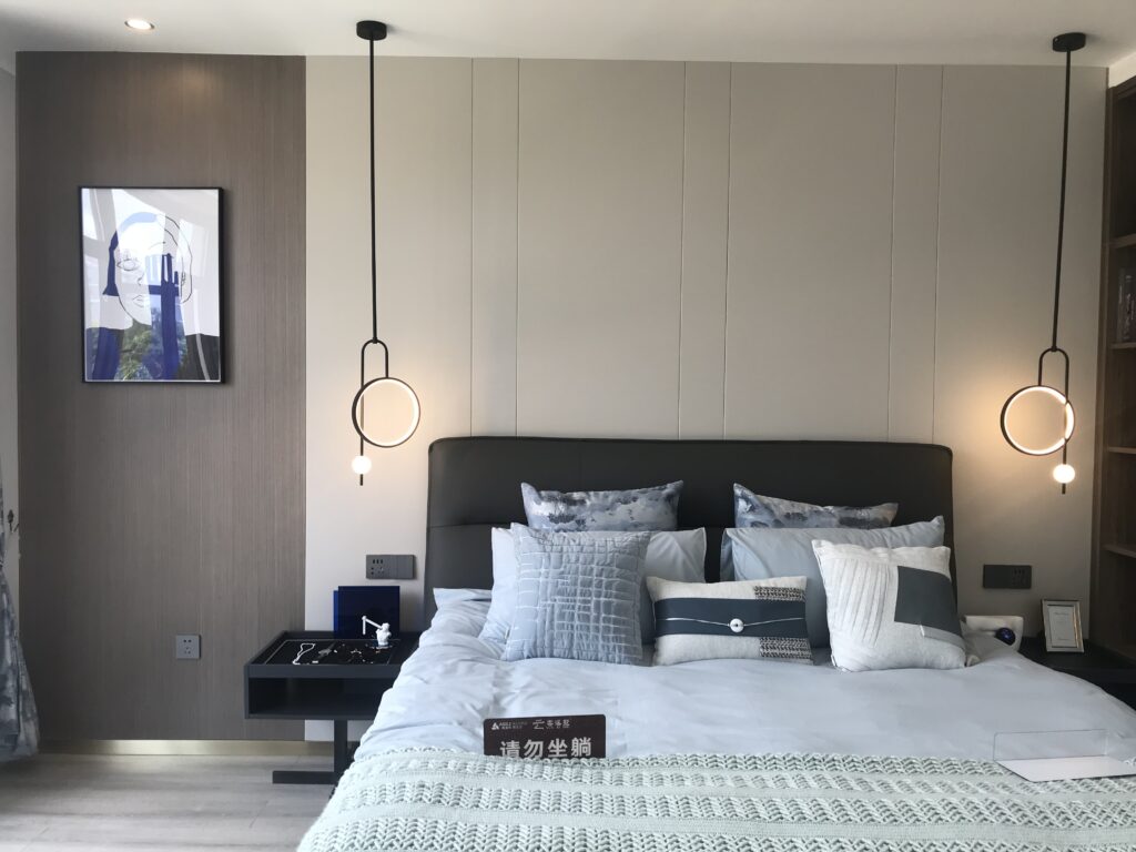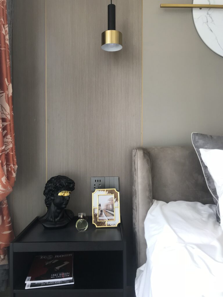 臥室背景用木飾面與硬包相結合,線條簡潔,飾品點綴烘托了低調高級的氛圍。