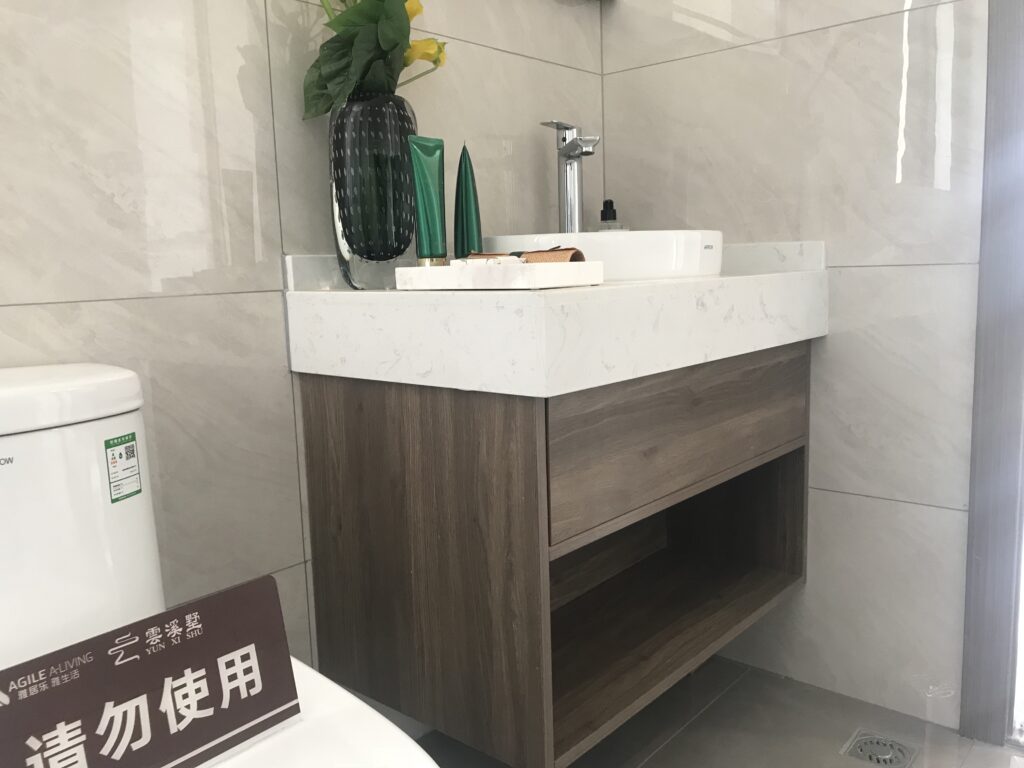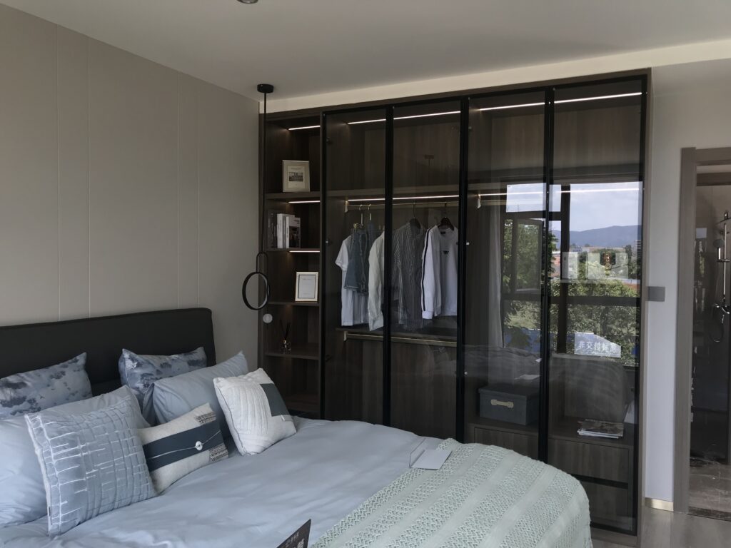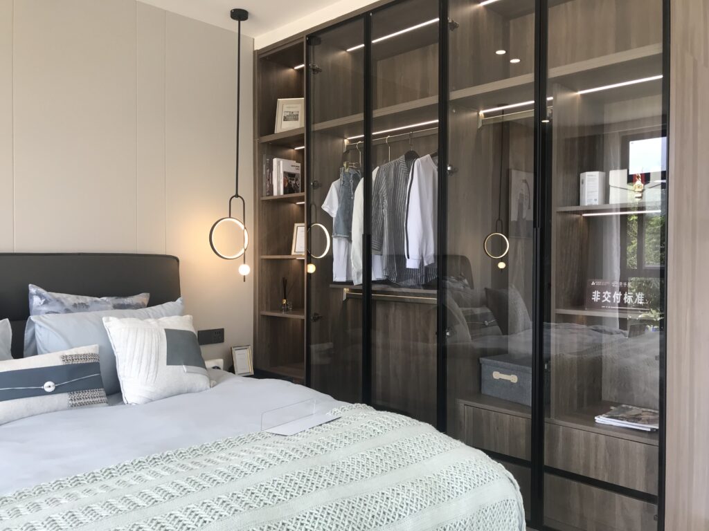 衣柜選用一門到頂板材,玻璃門與開放格搭配,增加空間通透感,讓歸家的人感受寧靜舒適的氛圍。