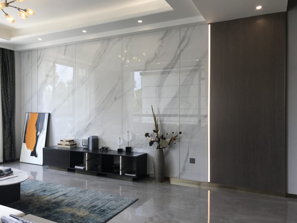 電視背景用巖板上墻,搭配木飾面與燈帶,大氣明亮。