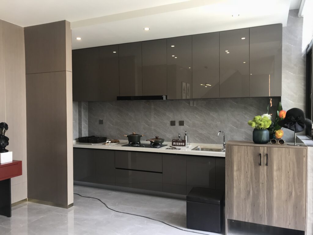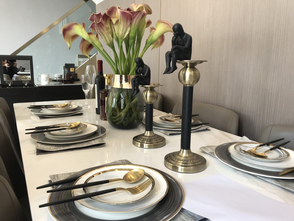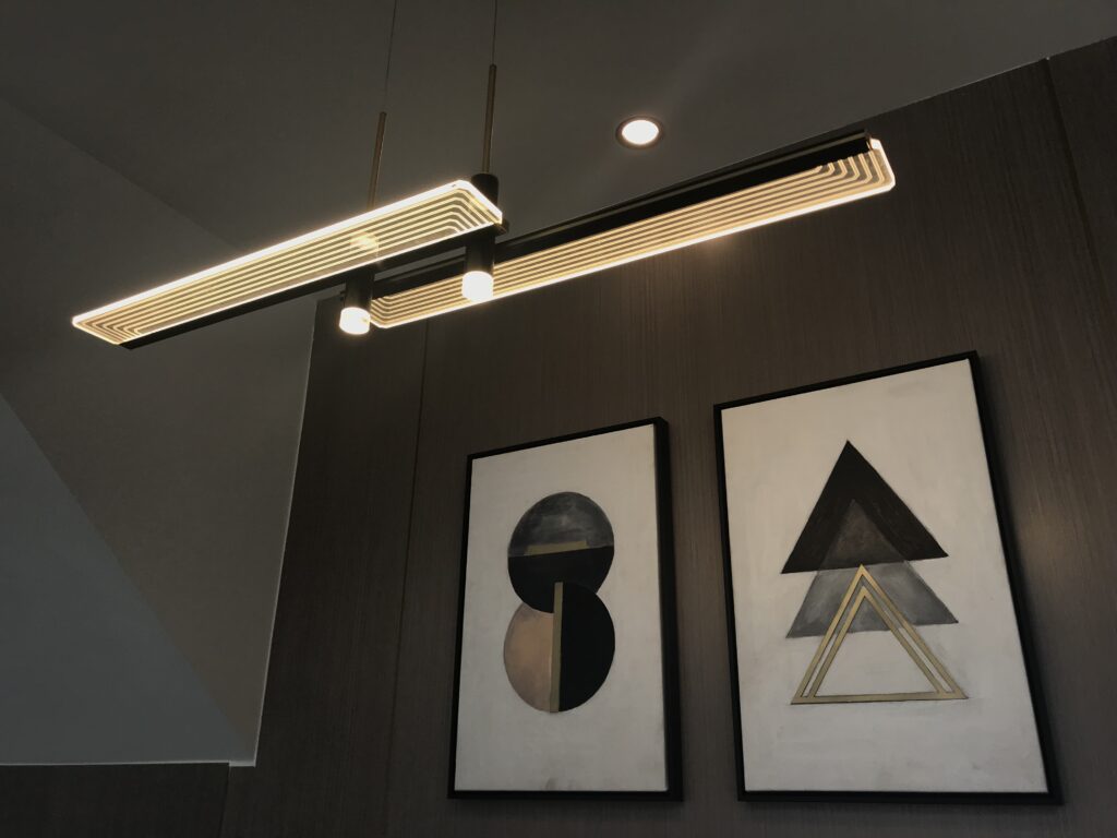 客餐廳墻面用科技木皮的烤漆木飾面上墻,紋理自然高級,搭配啞金的線條點綴,增加輕奢的質感。