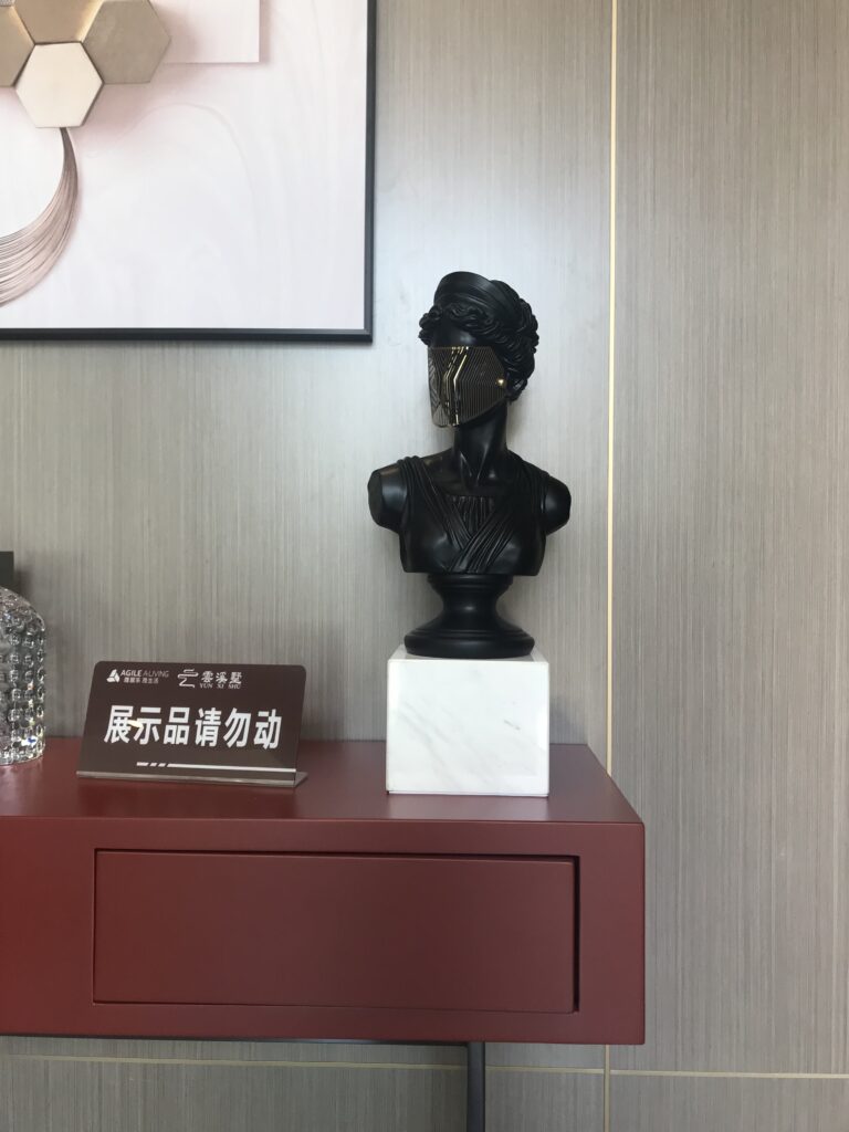 紅色端景柜左邊是一個隱形門,用木飾面與金屬線條左右對稱設計,弱化了門的存在,整體性更好。