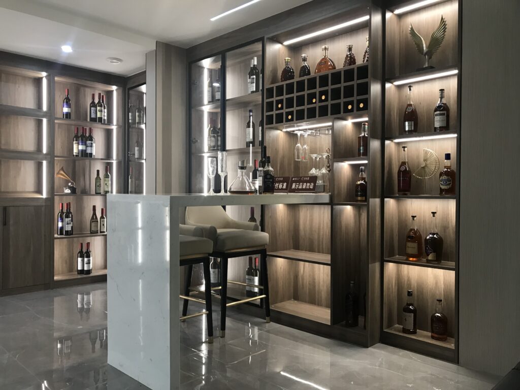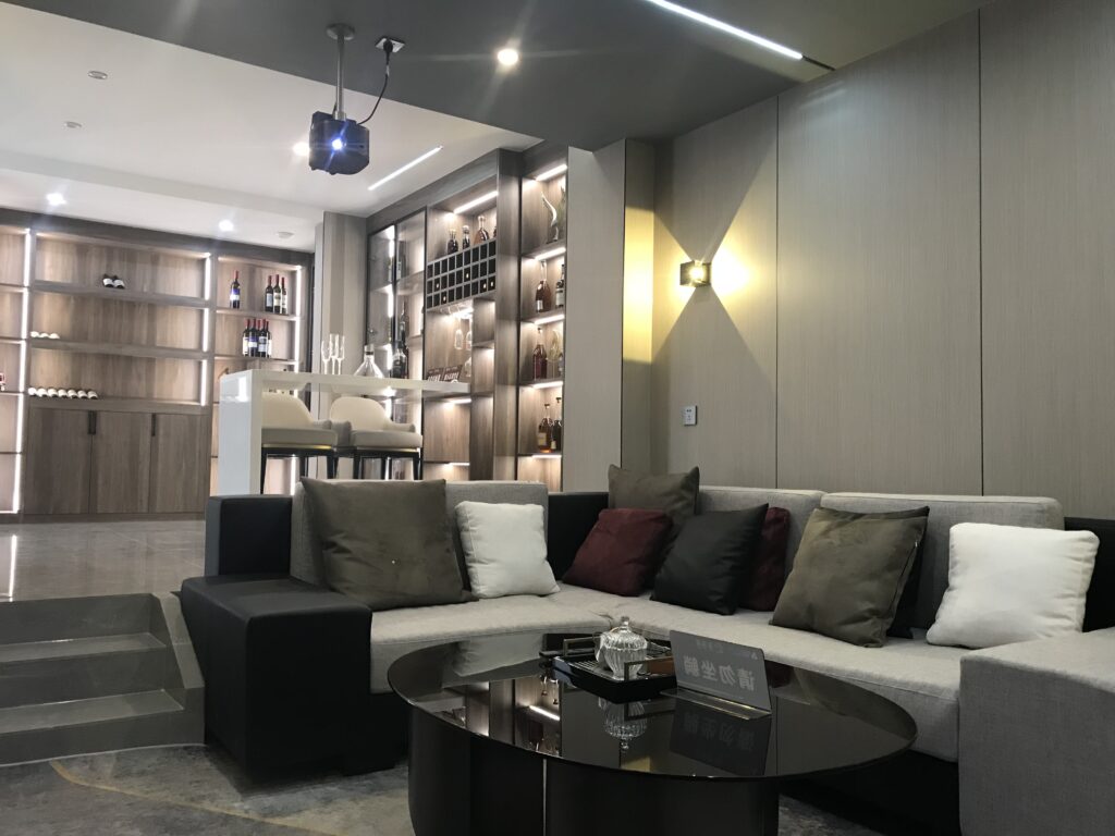 負一層的影音室功能豐富,業主愛好品酒收藏,兩面墻做了酒柜設計,融合了吧臺,滿足了儲酒的同時,也點亮了整個空間,適合朋友家人聚會。