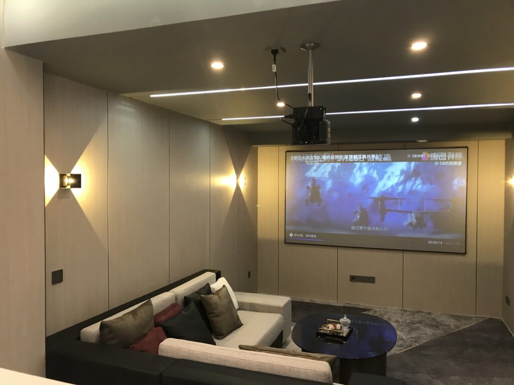 區域分隔做了一個下沉式的空間,木飾面上墻,色調統一,同時做了隔音處理。