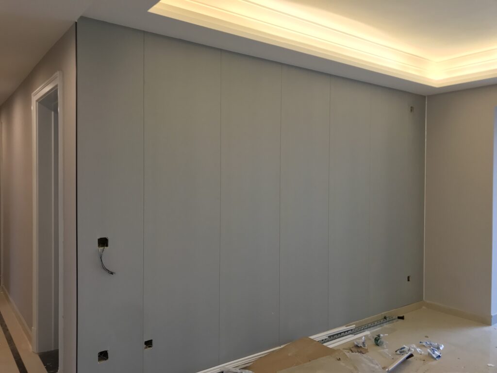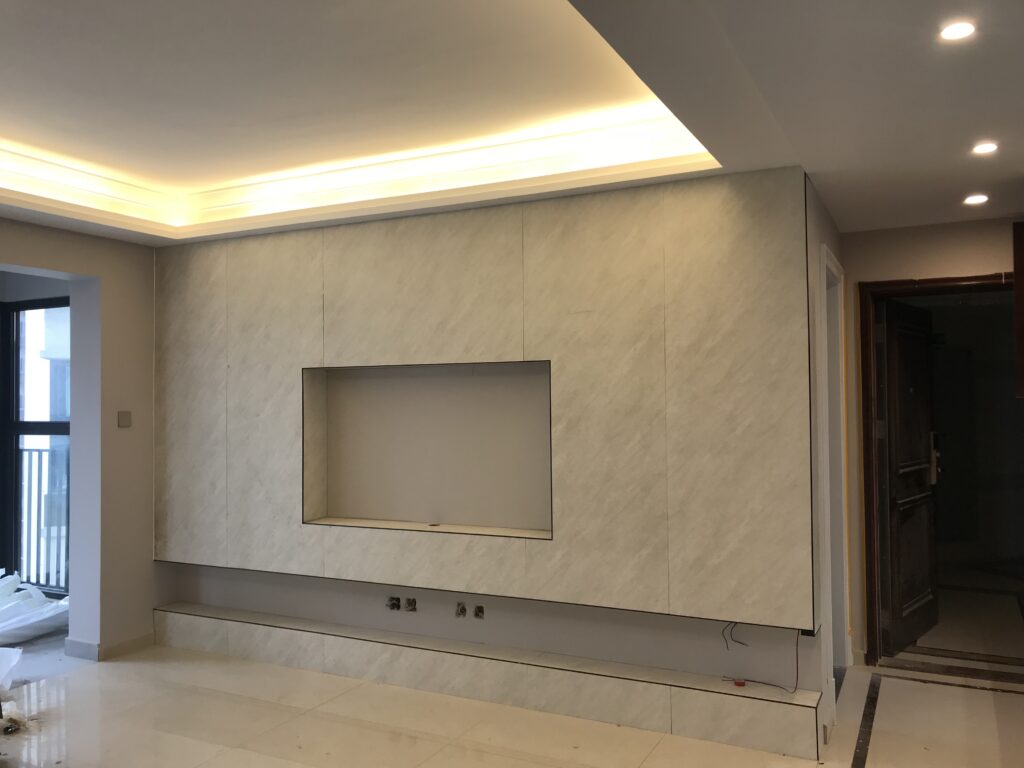 電視背景木飾面上墻做造型,內嵌電視,簡約耐看。