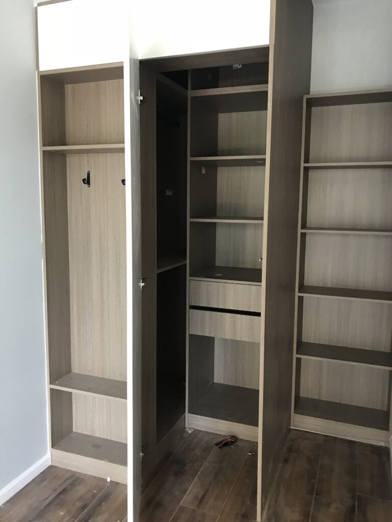 柜體門板選用純色高光板,結合窄邊框玻璃門,低飽和度的木色做柜體,整體搭配質感豐富,高級。