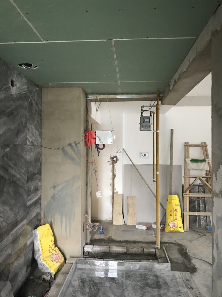 今天路過天怡峰景這邊,順手上來拍幾張現場進度照片。目前木工的吊頂已經完成,櫥柜地臺也砌的差不多了,整體進度已經做了一半。