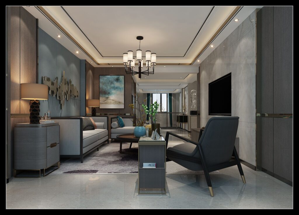 客廳背景用硬包和木飾面相結合,背景對稱設計,頂面線條與墻面線方形輪廓,搭配圓形燈具 茶幾,方圓融合,從細節處散發這中國文化氣息。