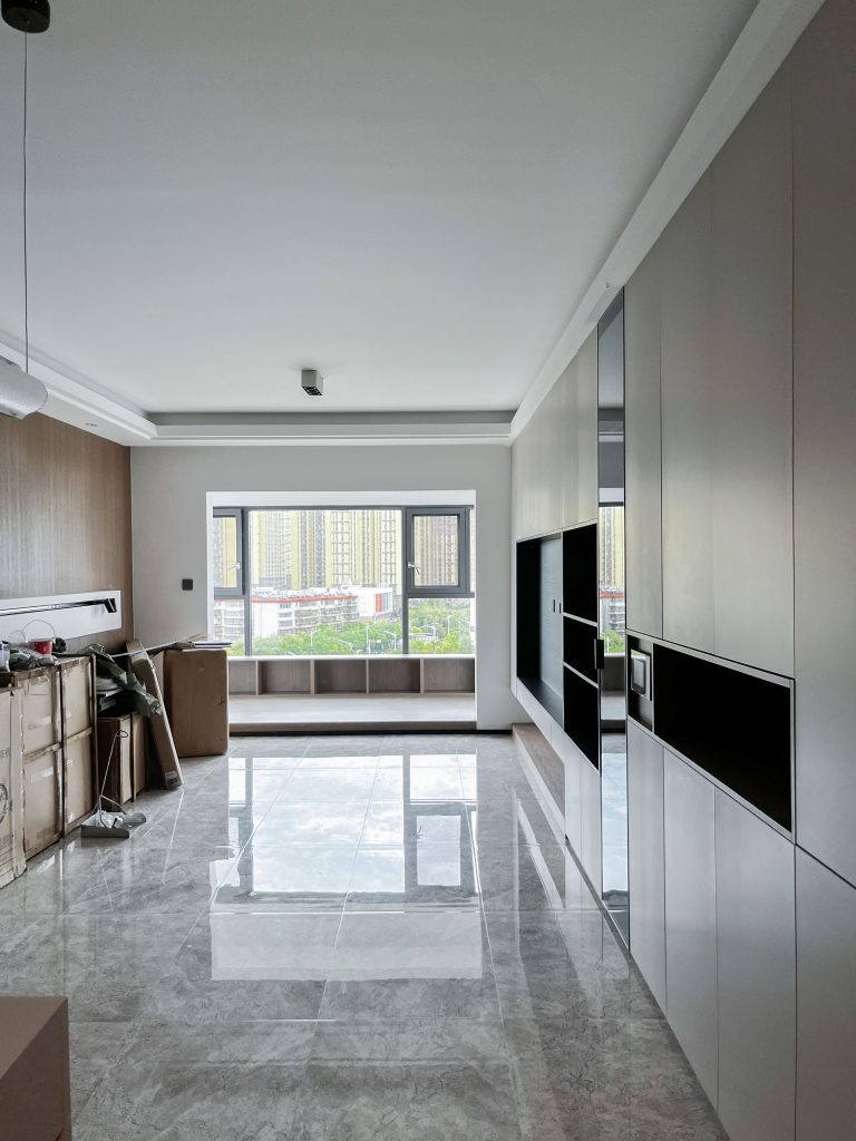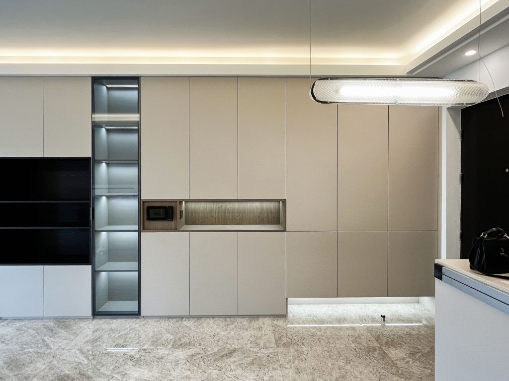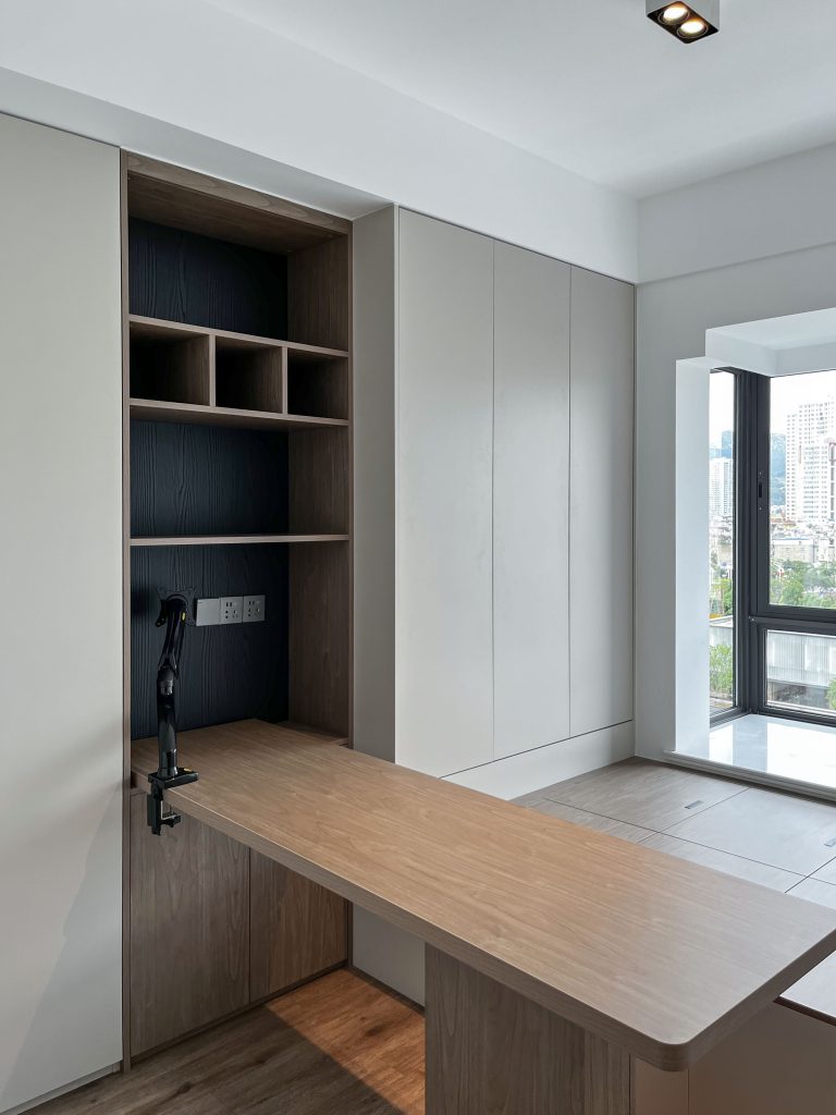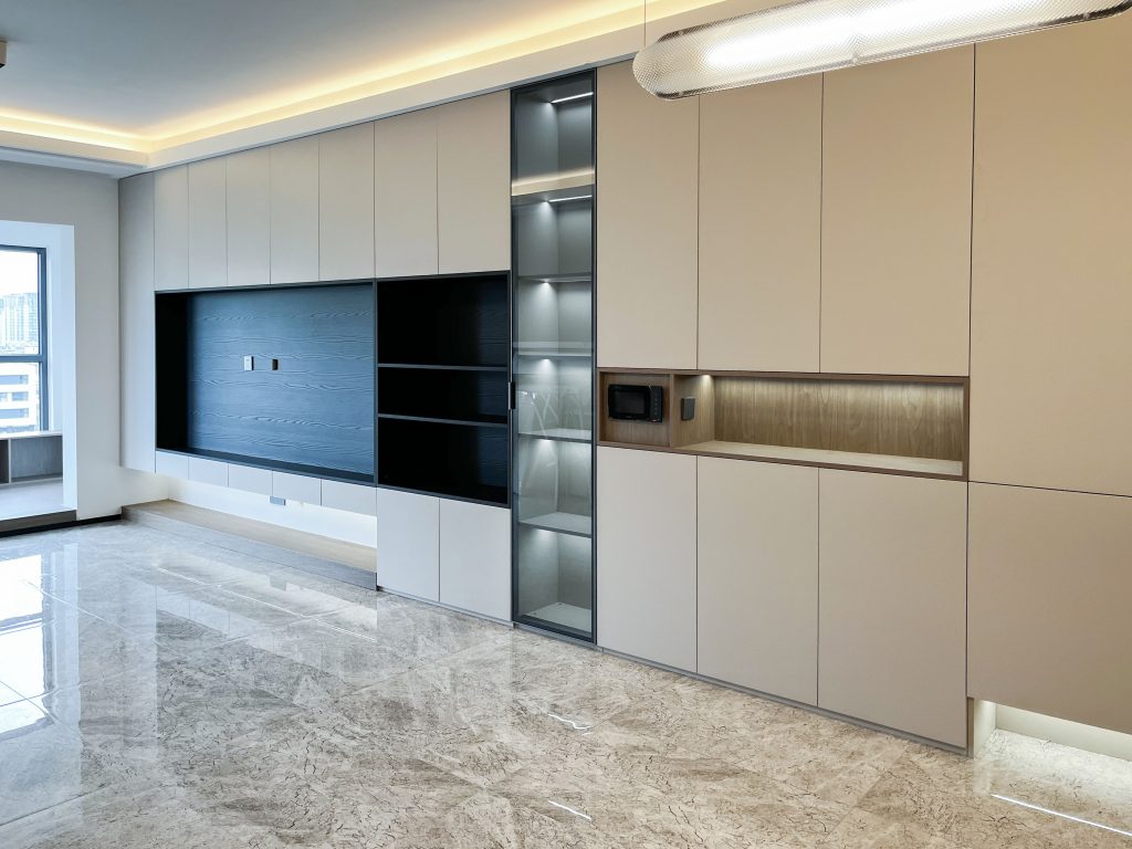 這是一套昆明萬科城·乘風上小區的精裝修改造案例,施工項目包含了:水電局部改造、木工吊柜體頂、全屋柜體定制、軟裝定制、燈具電器等。